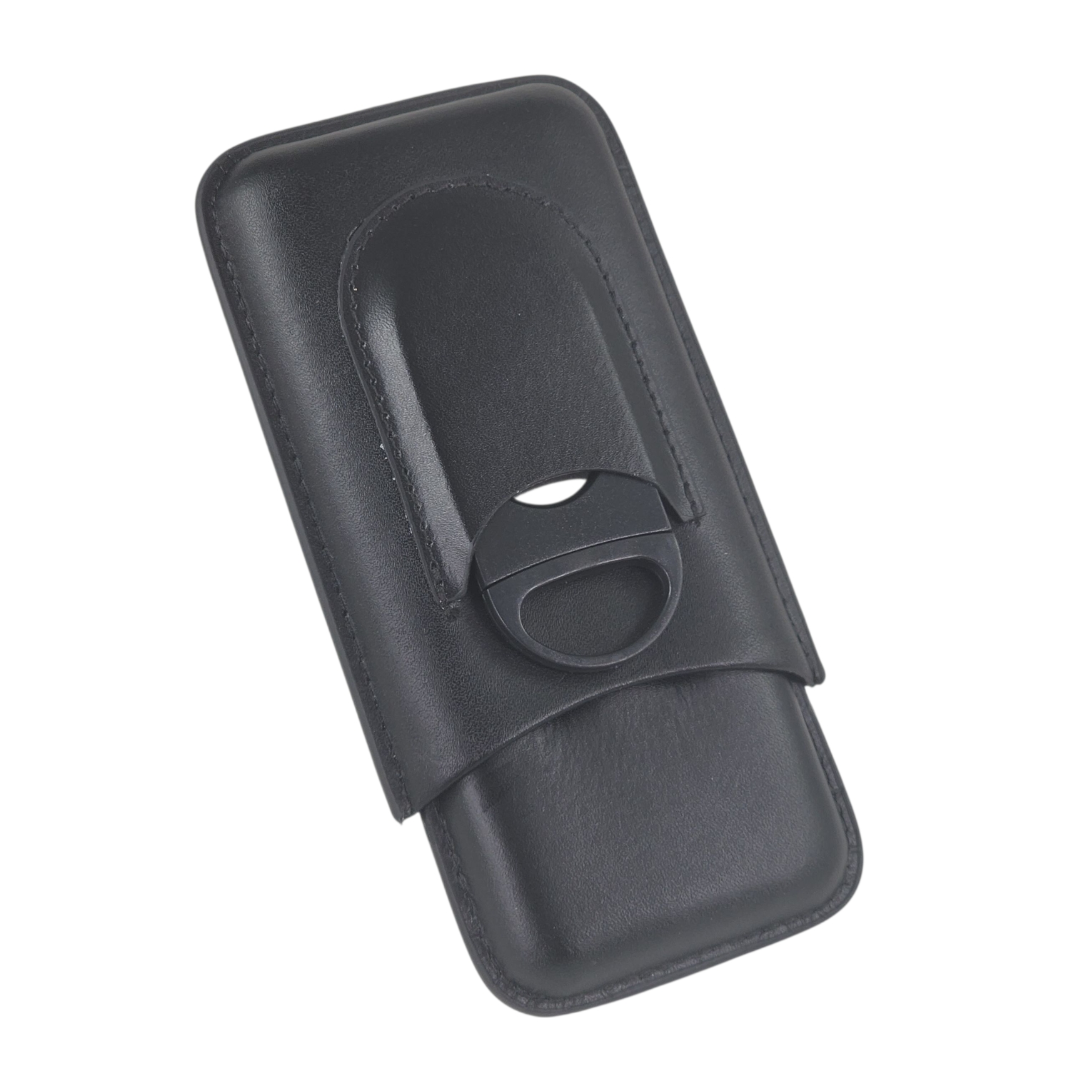 This genuine black leather cigar case holds 3 cigars and expands to accommodate your longer cigars. Includes a double guillotine cutter in a side pocket.