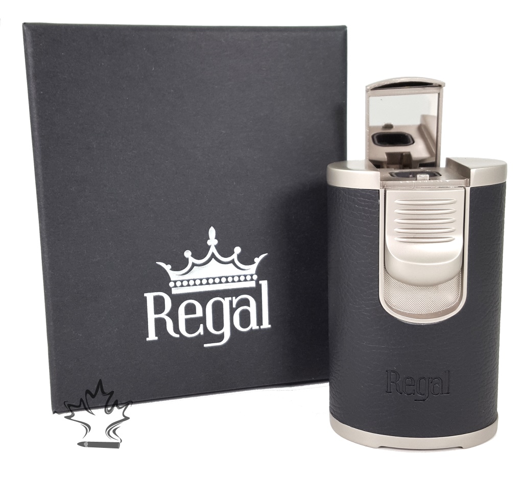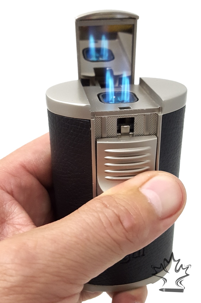 The Regal Quad flame table top lighter in light brown leather, with side mounted trigger, over-sized flame adjuster, high capacity fuel tank and all shipped in an attractive gift box... Is truly an amazing torch.