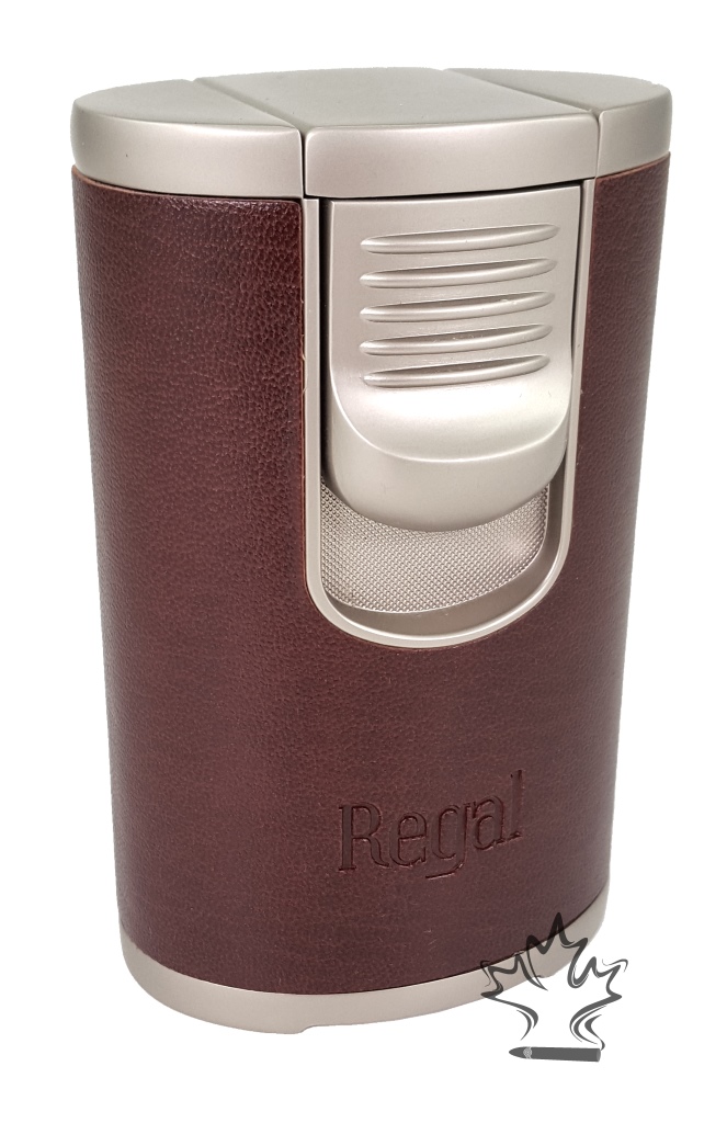The Regal Quad flame table top lighter in light brown leather, with side mounted trigger, over-sized flame adjuster, high capacity fuel tank and all shipped in an attractive gift box... Is truly an amazing torch.