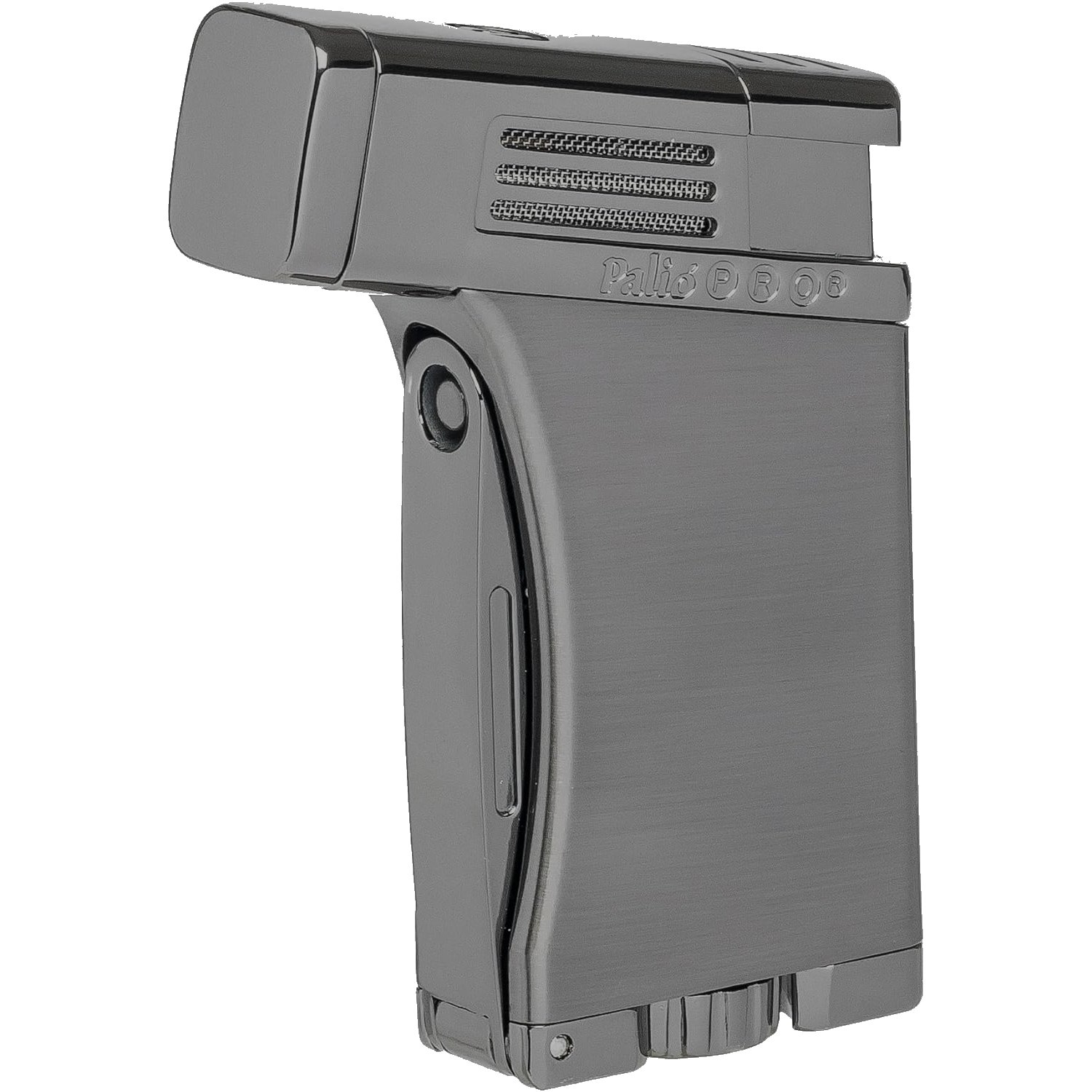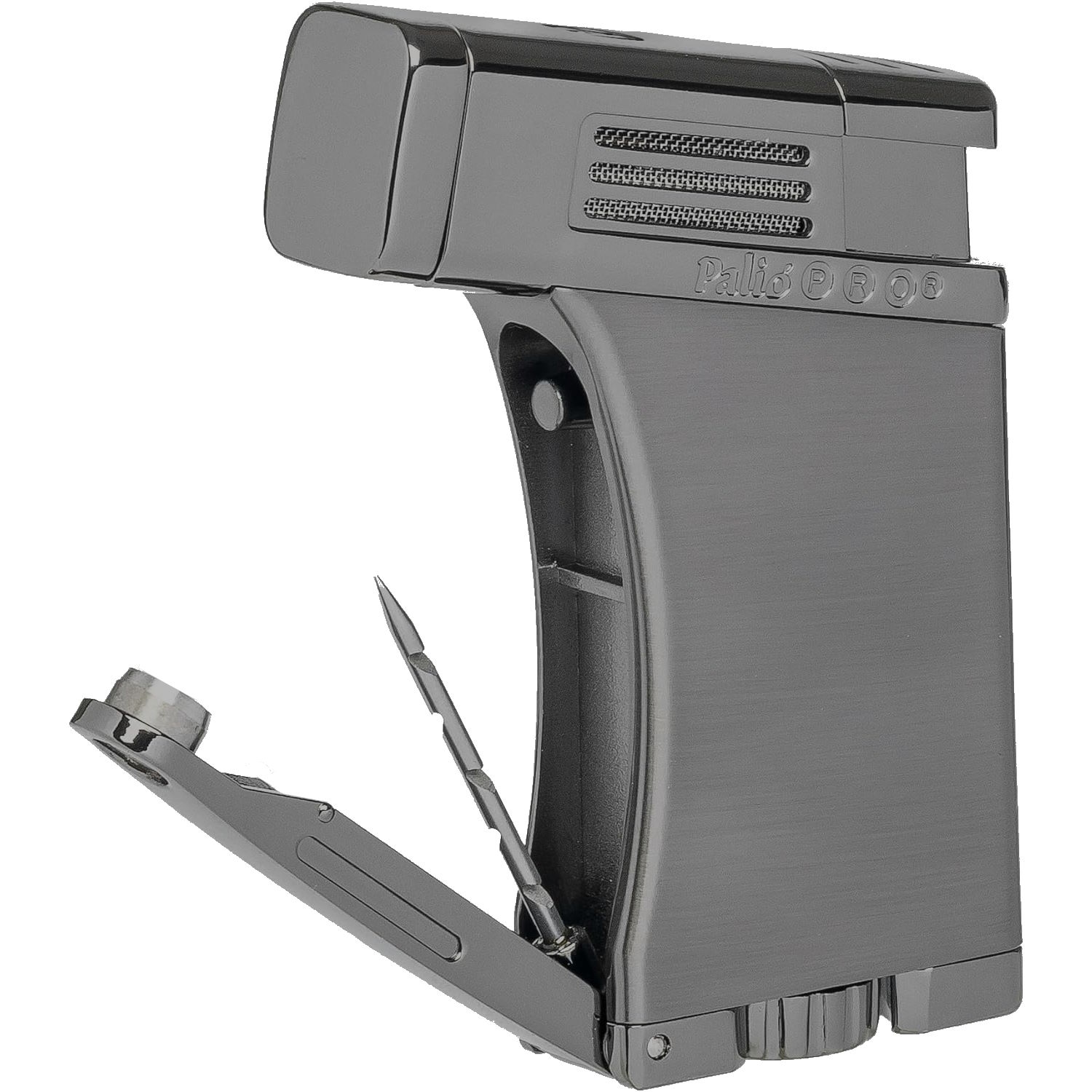 The PALIO® Pro Scorpius is a large, angled, single-jet torch lighter with a foldout 7.5mm punch cutter, and a 33mm (1.3") cigar enhancement poker in an all-metal body.