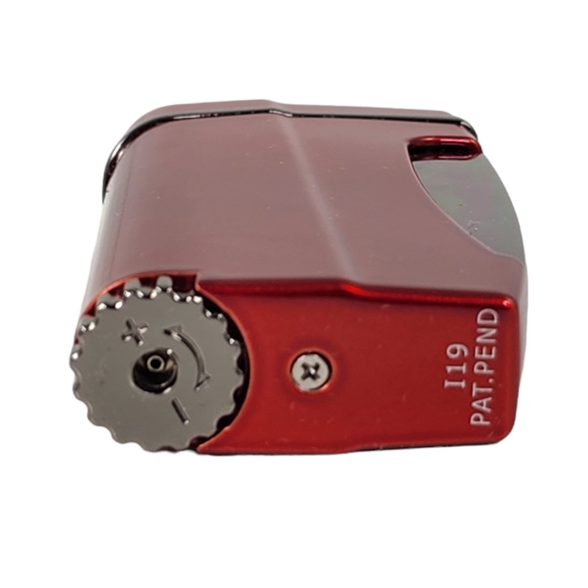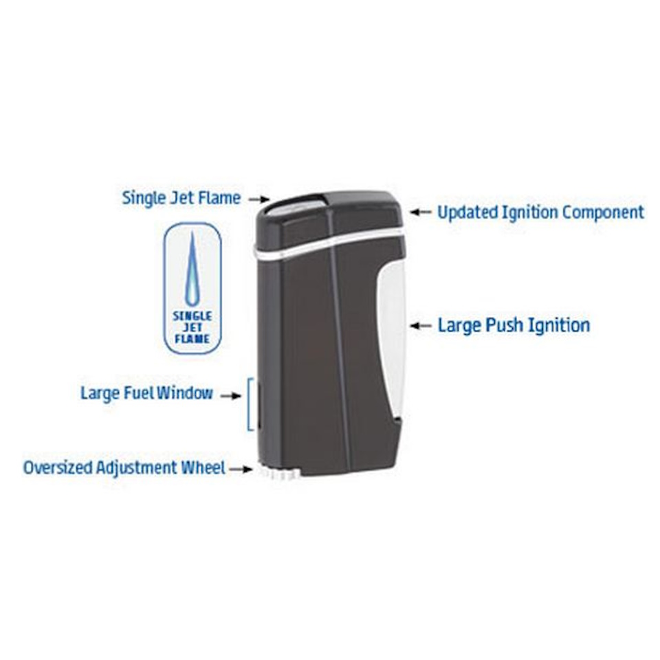 By placing the trigger along the lighter body, one's finger is no longer perilously close to the flame (no burned fingertips!) A simple push of the side of the lighter ignites a powerful jet flame perfect for cigars or that camp fire that needs a little encouragement.