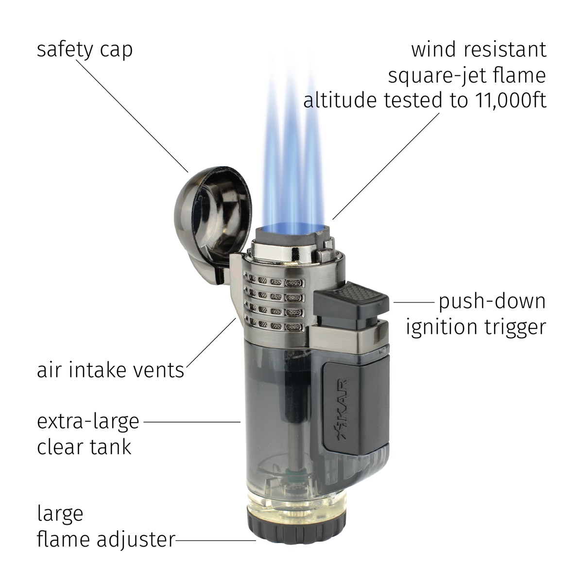 Xikar Tech lighters feature a large fuel tank, quad jet flame and durable body style that achieve XIKAR's commitment to form, feel and function. Tech Lighters combine a sleek transparent body design with solid metal construction at an affordable price. Great for outdoor usage or camping.