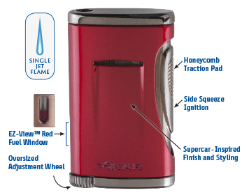 By placing the trigger along the lighter body, one's finger is no longer perilously close to the flame (no burned fingertips!) A simple push of the side of the lighter ignites a powerful jet flame perfect for cigars or that campfire that needs a little encouragement.